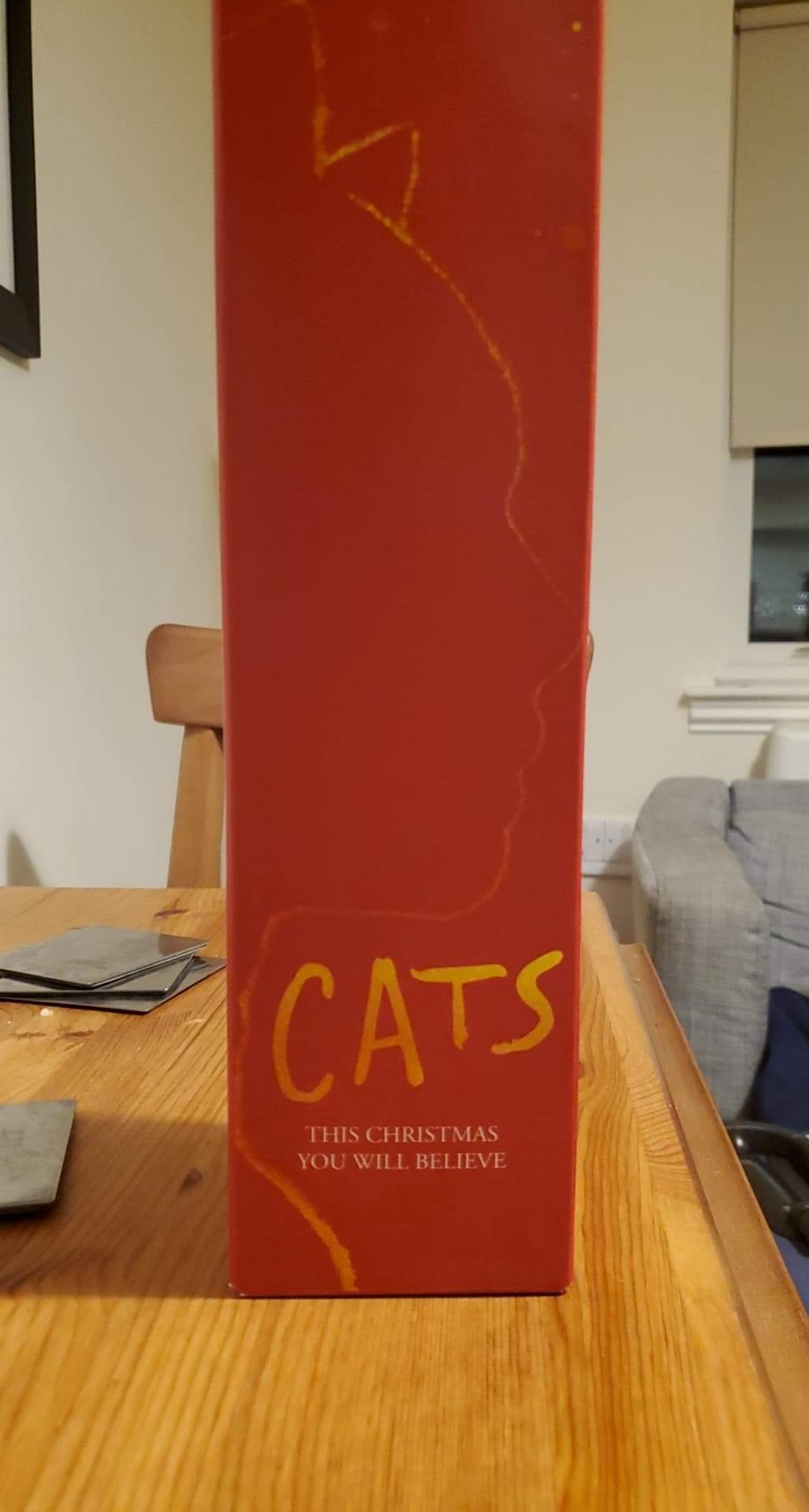 There is one intriguing tagline, though, that didn’t make it to the trailers. One March night in Scotland, two of my friends walked into Tesco and were thrilled to come across a bottle of Cats-branded champagne from Piper Heidsieck. Yes, the very same Piper Heidsieck parodied as Pi-purr Heidsieck in the background of “Jellicle Songs for Jellicle Cats.” It was a decent bottle of champagne, but its appearance in a grocery store three whole months after the film’s release says quite a lot about the film’s mainstream popularity, or lack thereof. The box bore the words, “This Christmas, you will believe.”